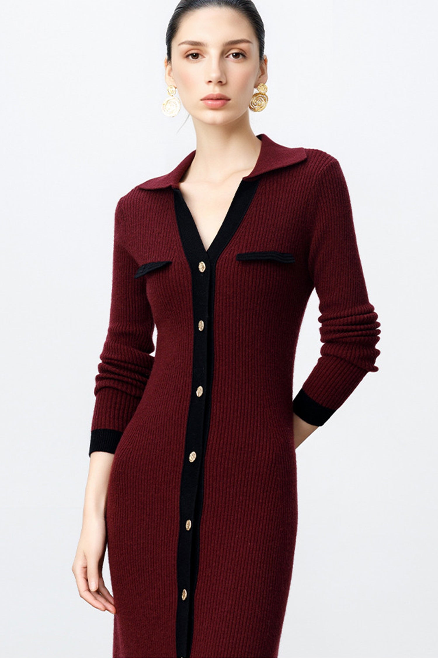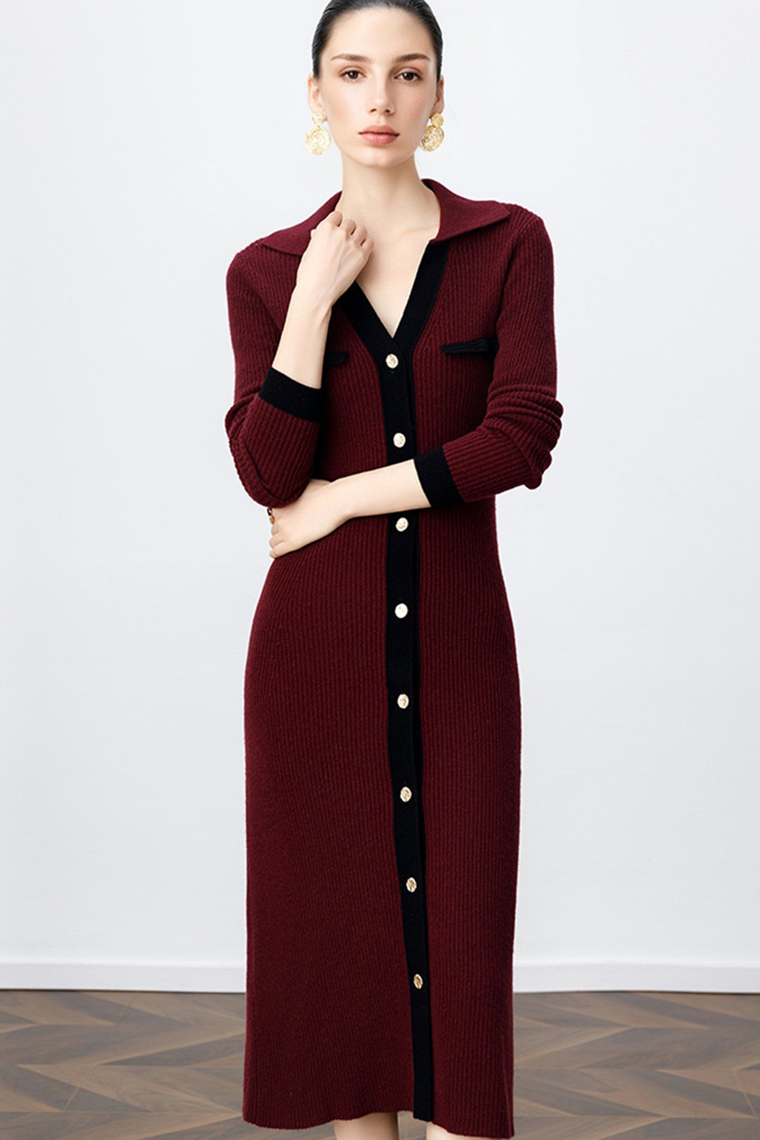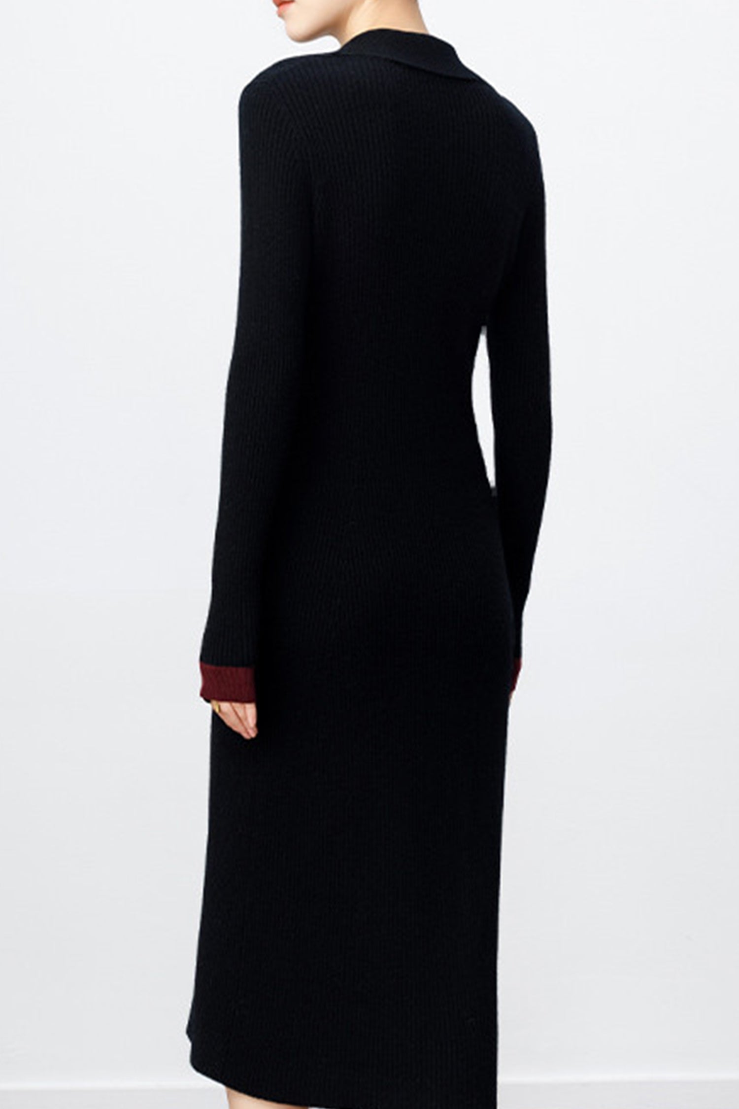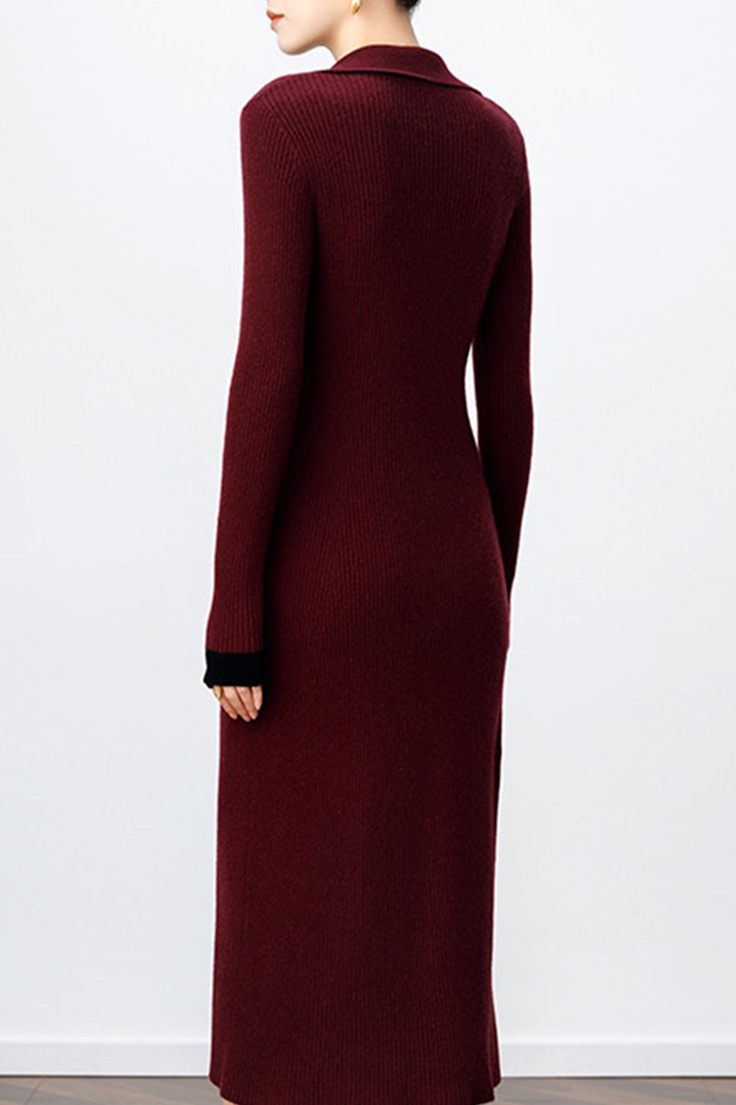 The ribbed wool cardigan dress has a gentle drape that follows your shape without feeling tight, paired with a soft collar and subtle contrast accents that keep things polished. It’s the kind of piece you reach for when you want comfort, warmth, and a little bit of charm—all at once.