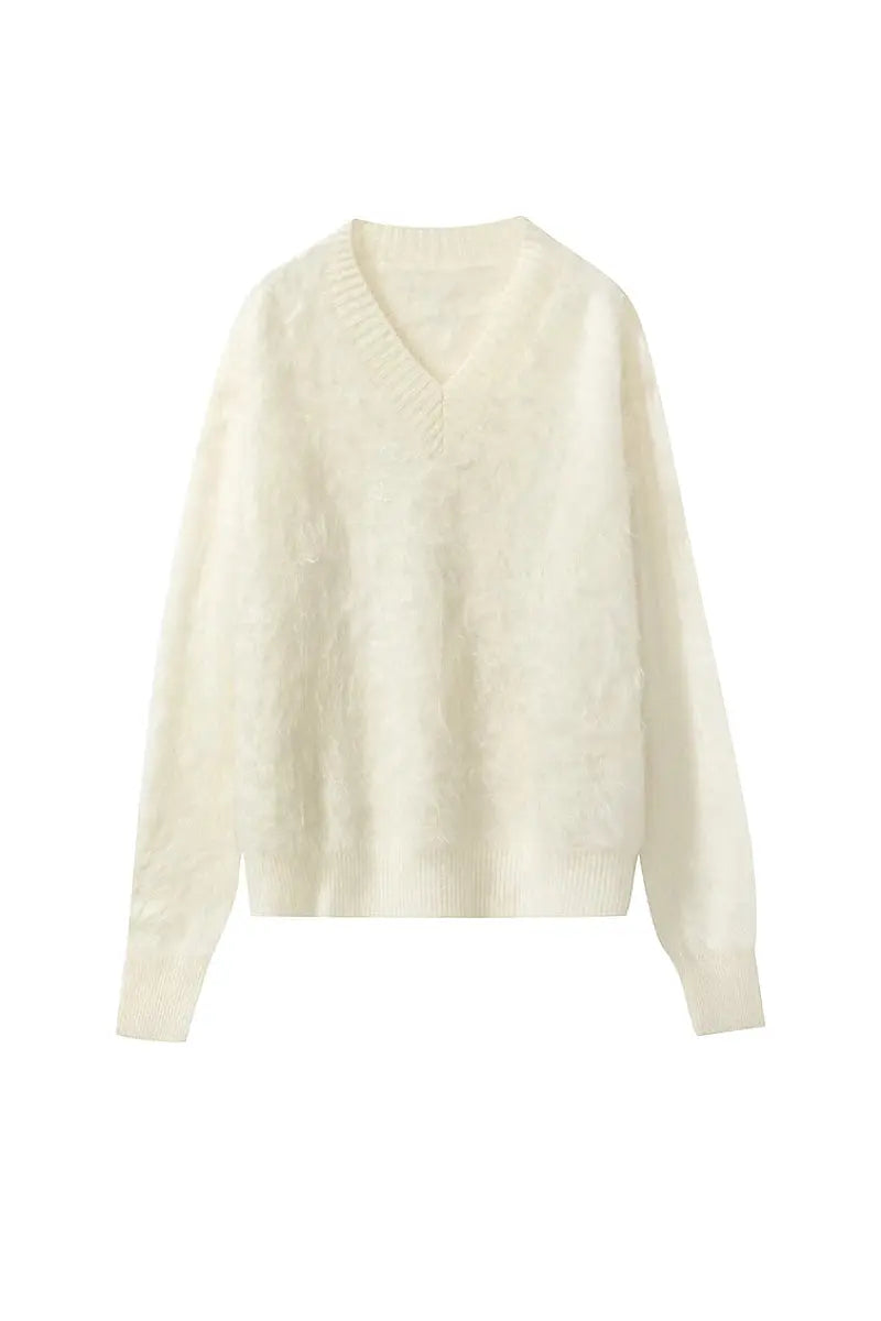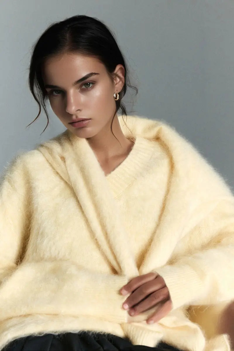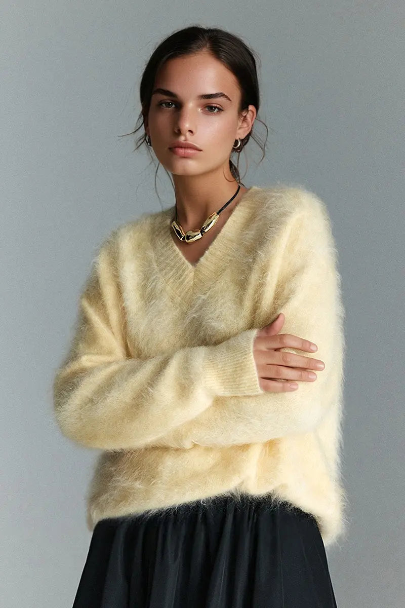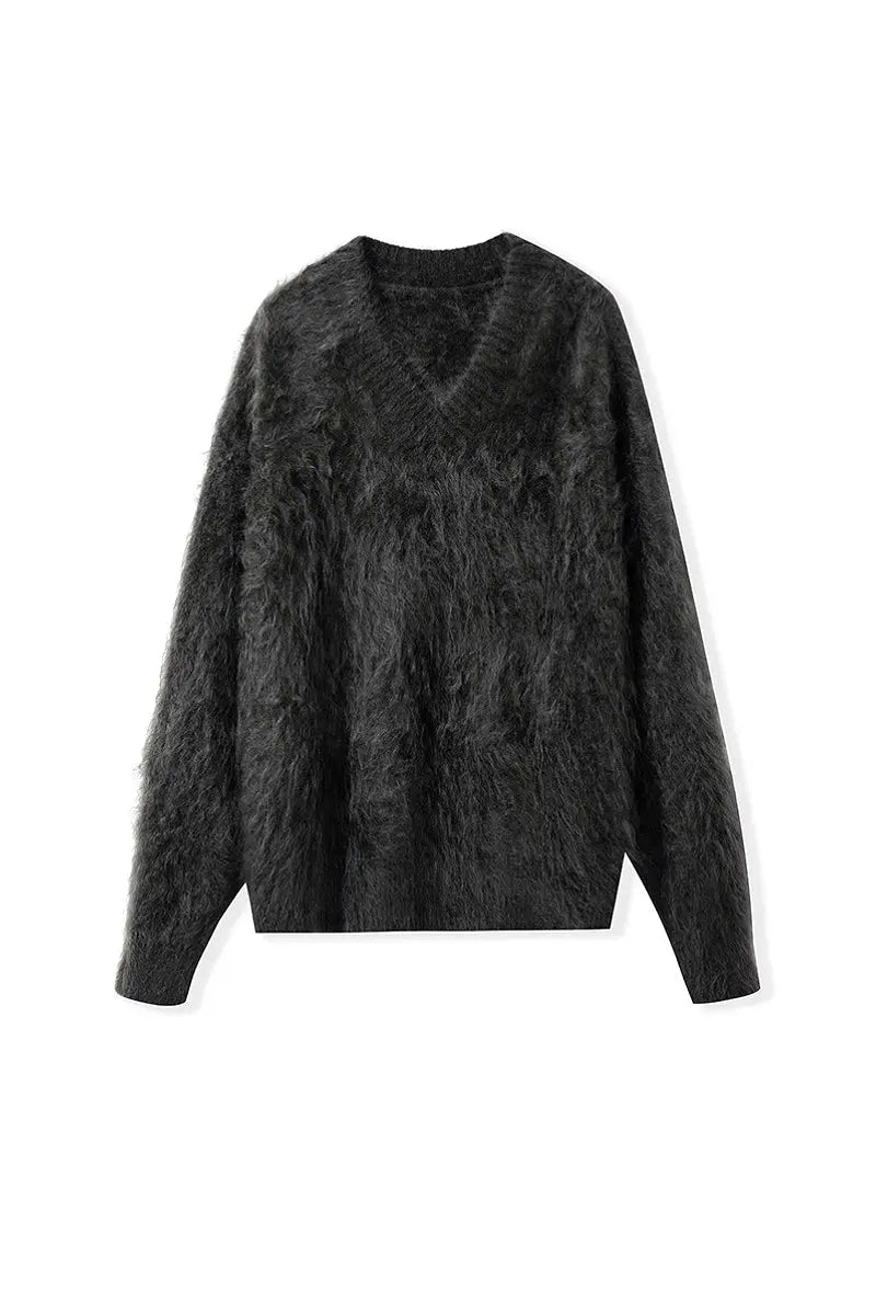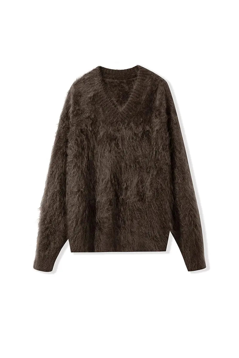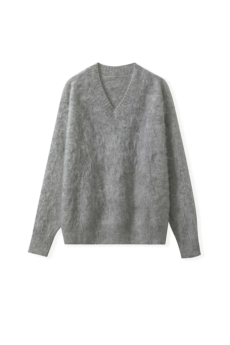 Indulge in the warmth of this chunky brushed cashmere sweater, crafted for effortless elegance and unmatched softness. The relaxed V-neck design and cozy silhouette make it an ideal layer for any occasion.