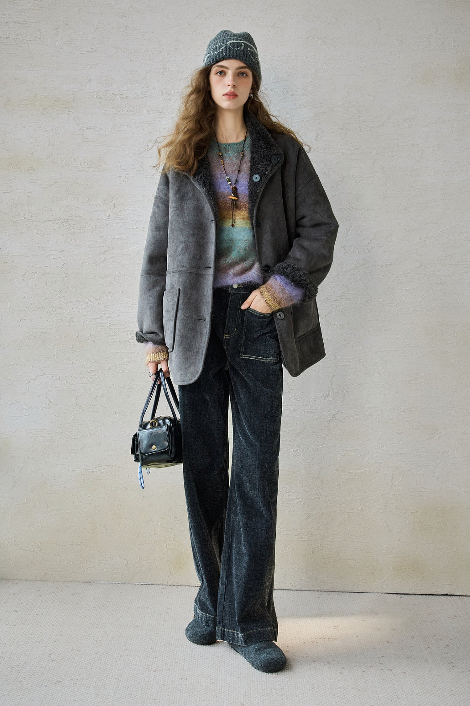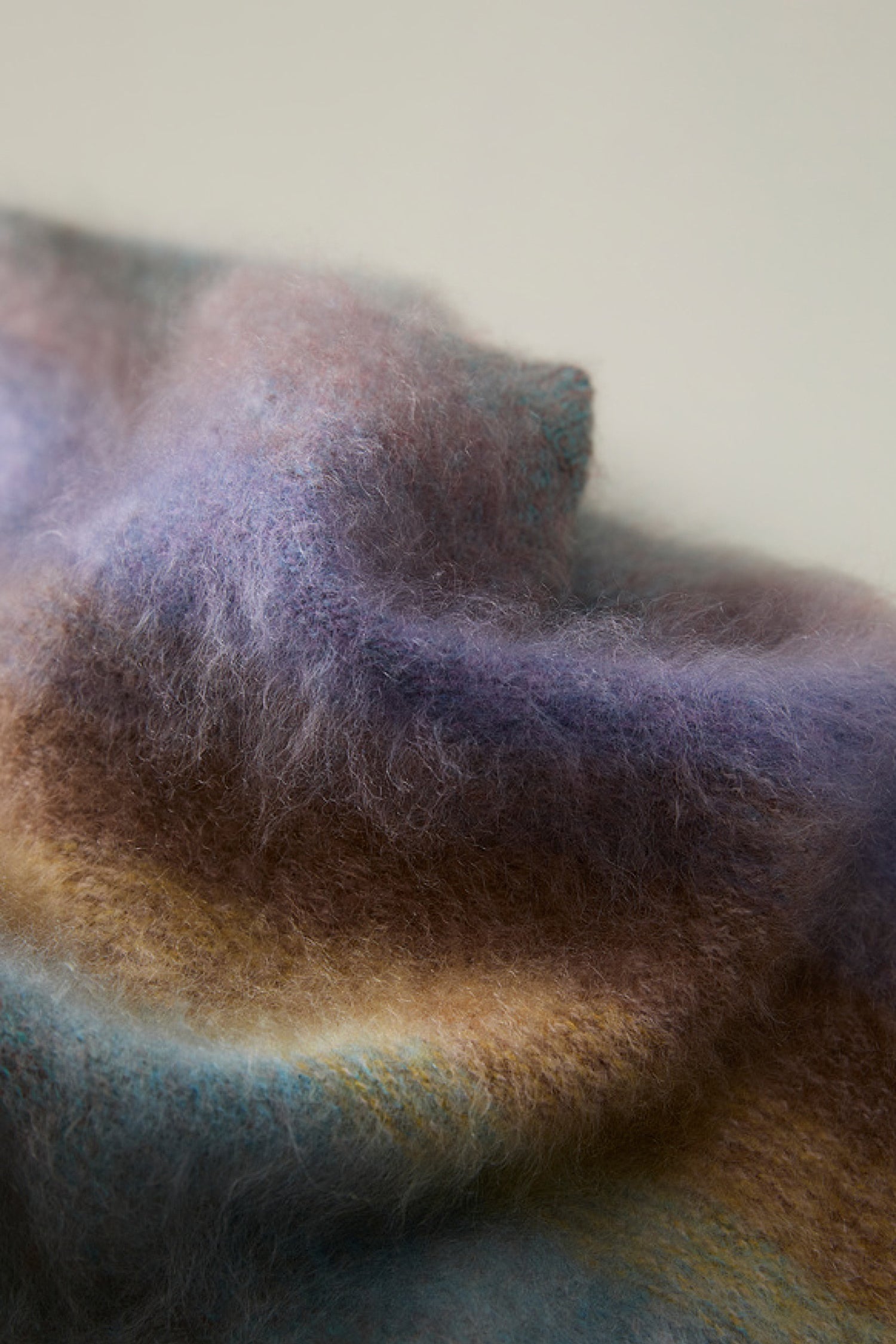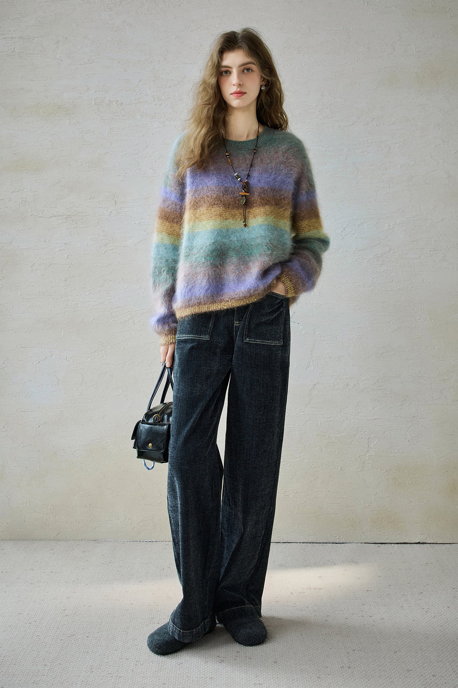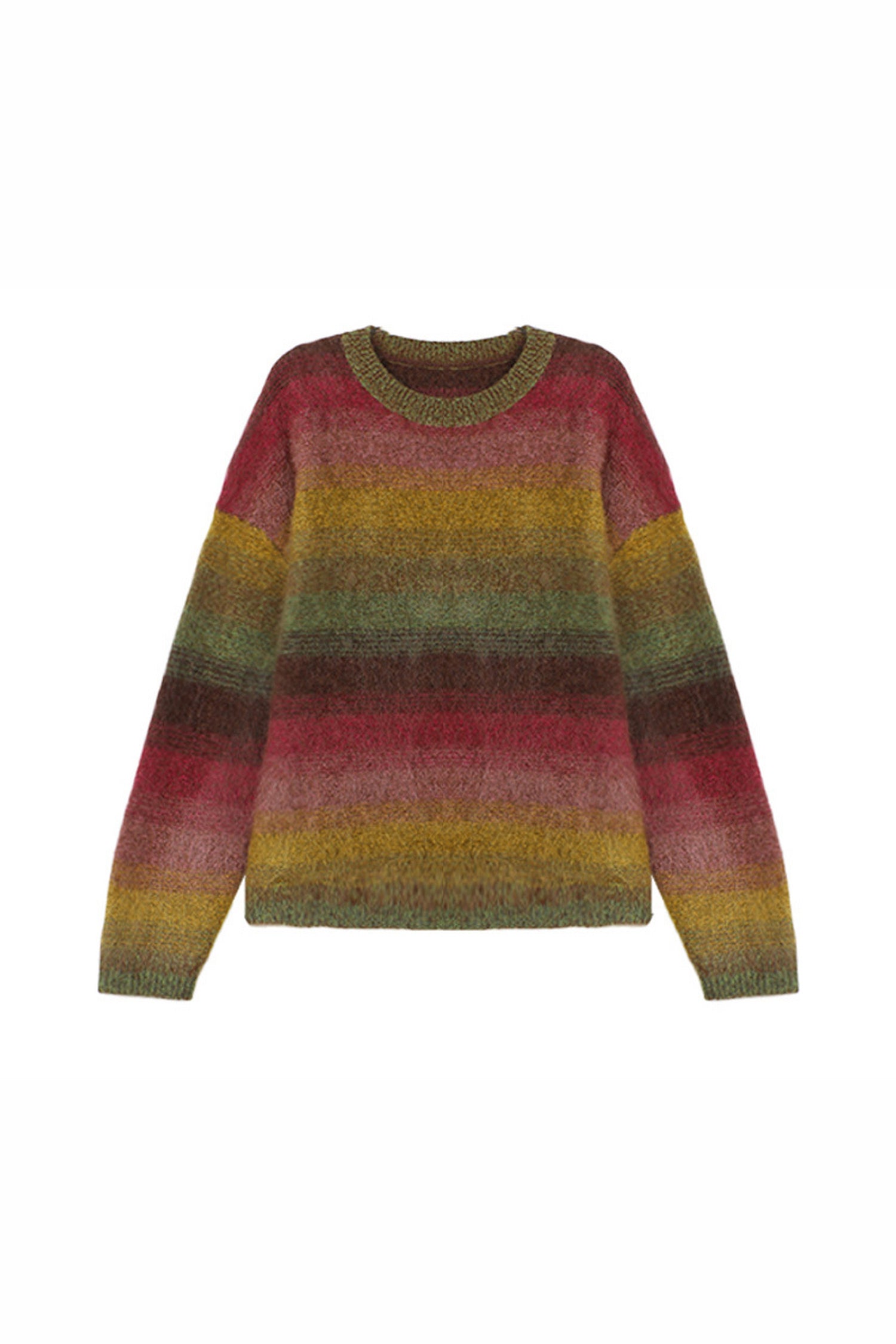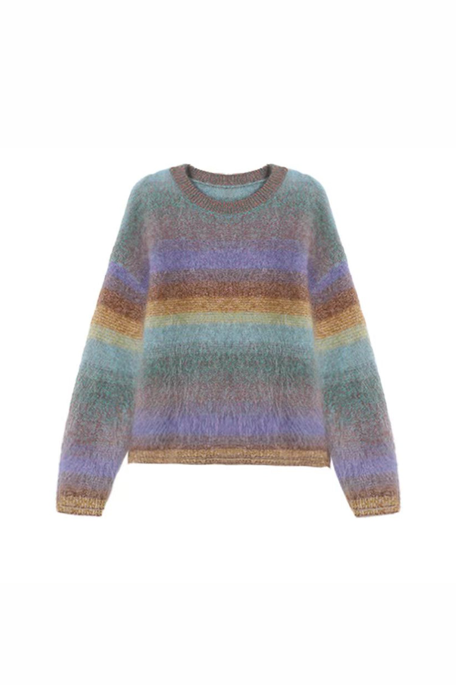A refined brushed process adds a soft-focus haze, enhancing warmth while giving the gradient stripes their diffused, luminous texture. Two rainbow-inspired palettes bring a warm, atmospheric glow to cooler days—playful yet sophisticated.Pair it with denim or tailored wool trousers for a relaxed, effortless winter look.