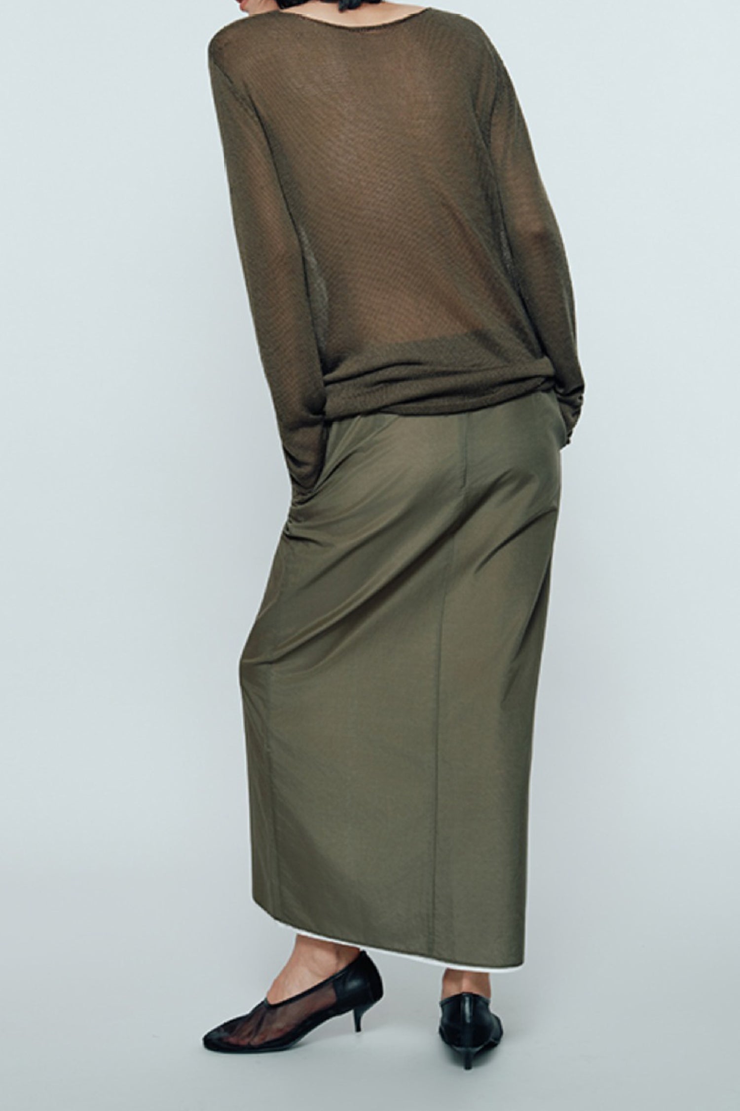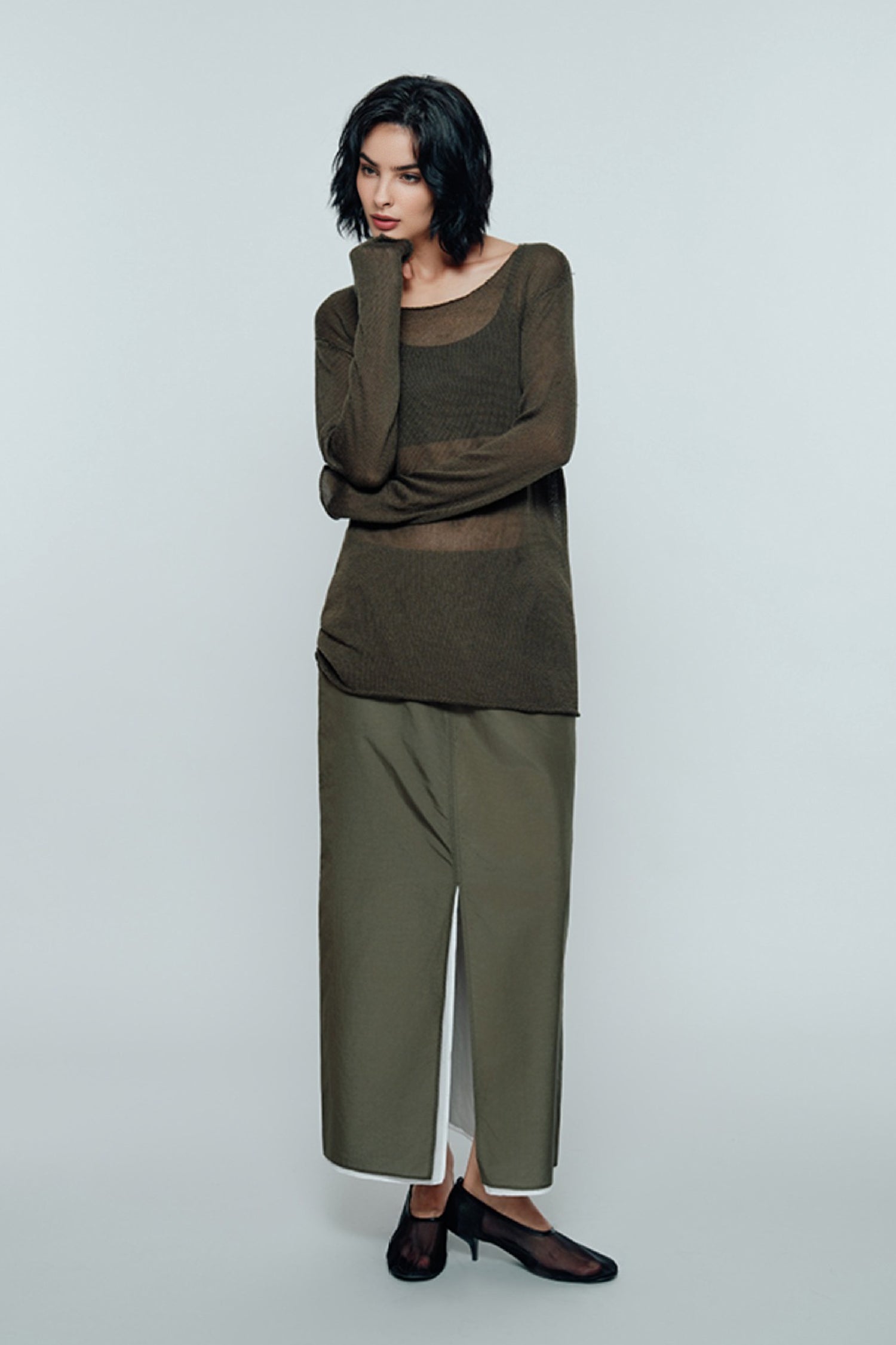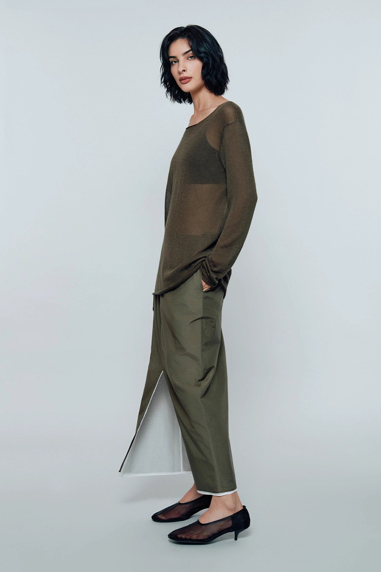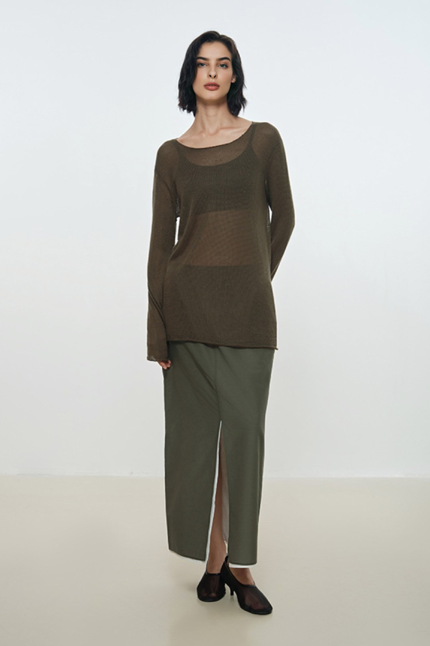 Barely there yet undeniably refined, this sheer long sleeve top combines silk and cashmere for a featherlight feel. The open-knit texture lets air and light flow freely, offering a graceful, see-through layer that lives close to the skin.