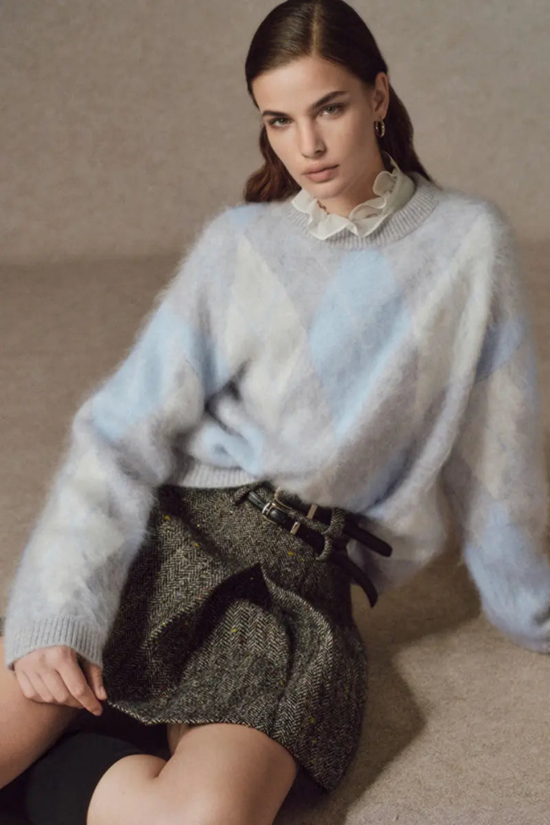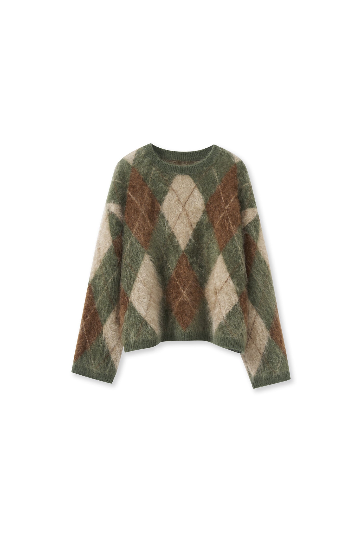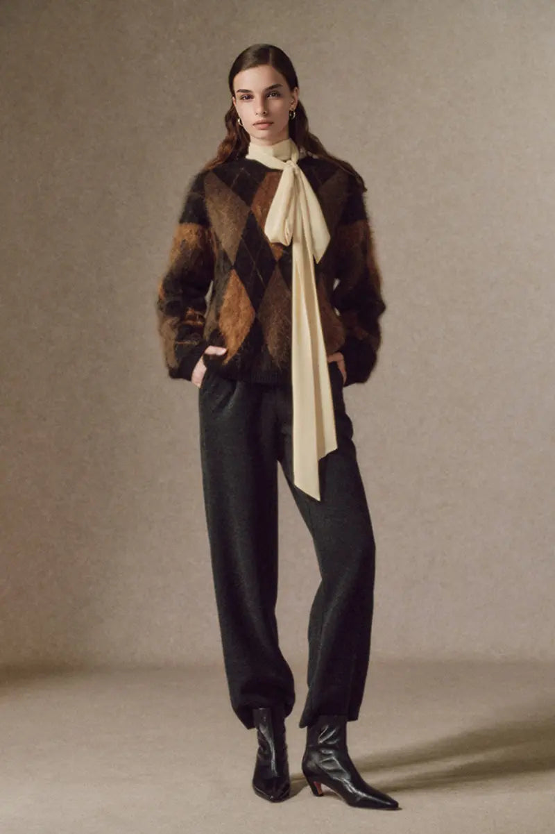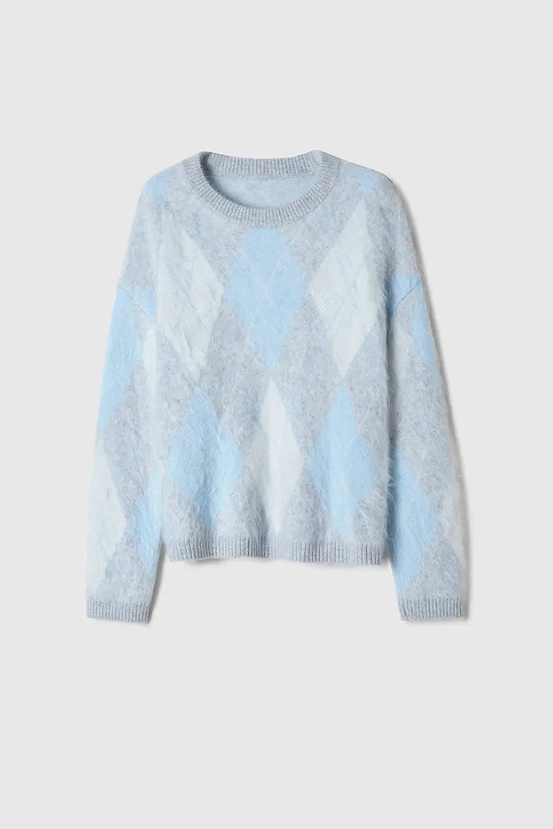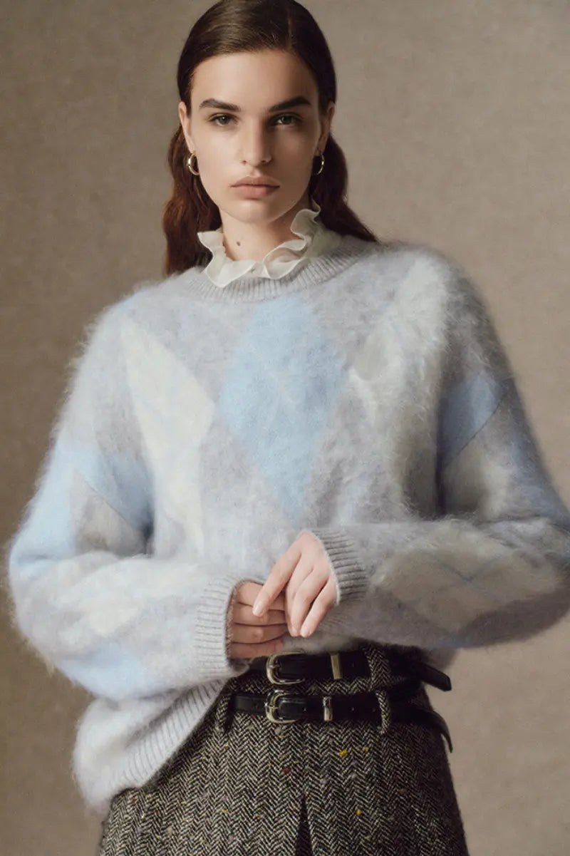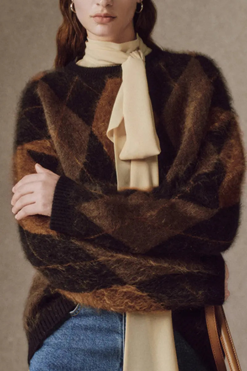 This brushed cashmere sweater redefines elegance with its vintage argyle pattern and cozy chunky knit. Featuring a classic crewneck design, it's the perfect light cashmere sweater for layering or standalone wear.