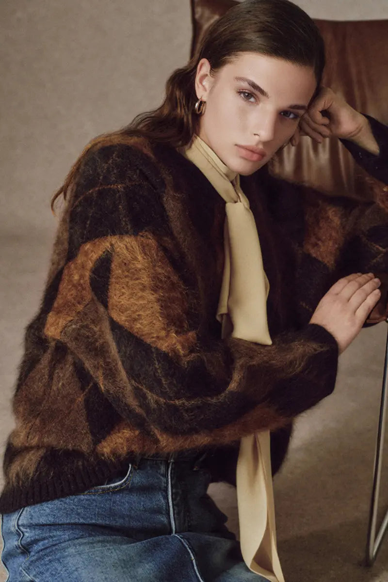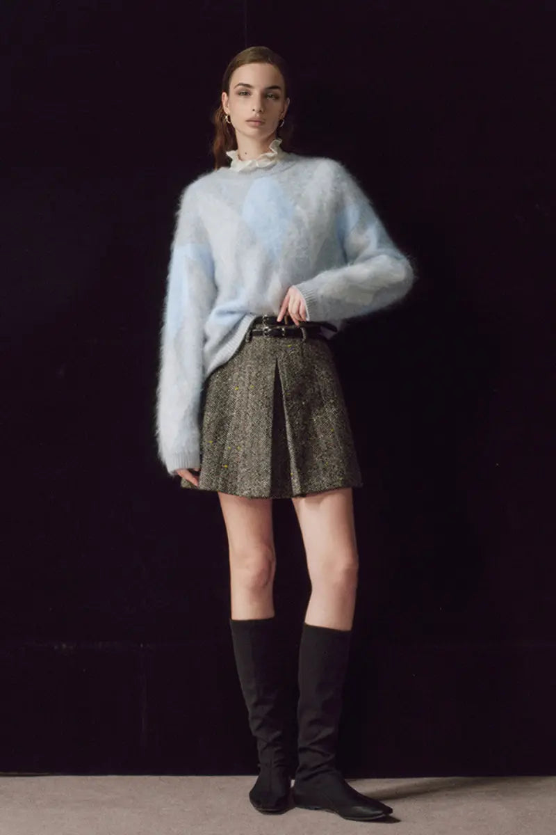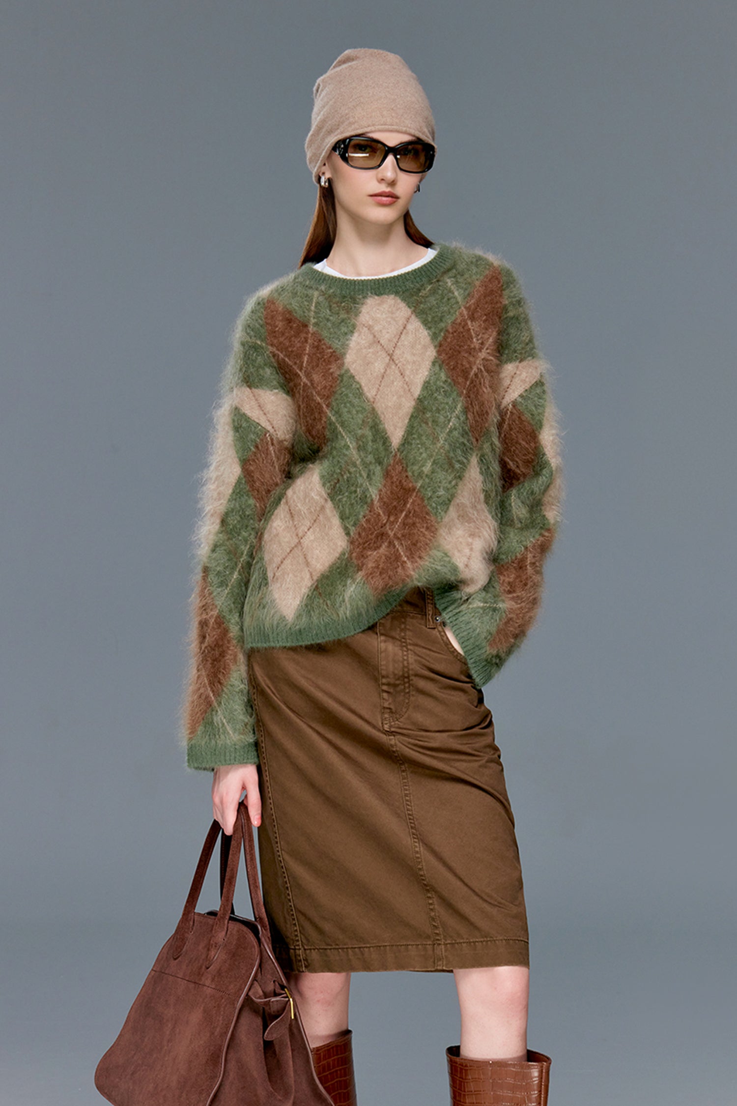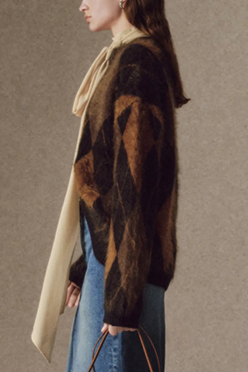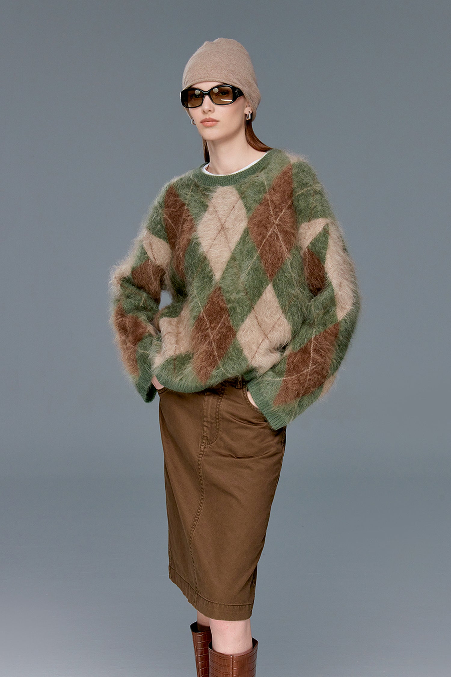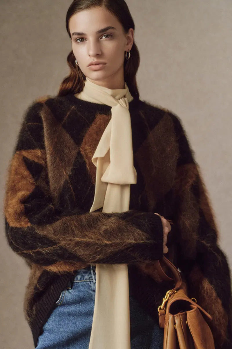 This brushed cashmere sweater redefines elegance with its vintage argyle pattern and cozy chunky knit. Featuring a classic crewneck design, it's the perfect light cashmere sweater for layering or standalone wear.